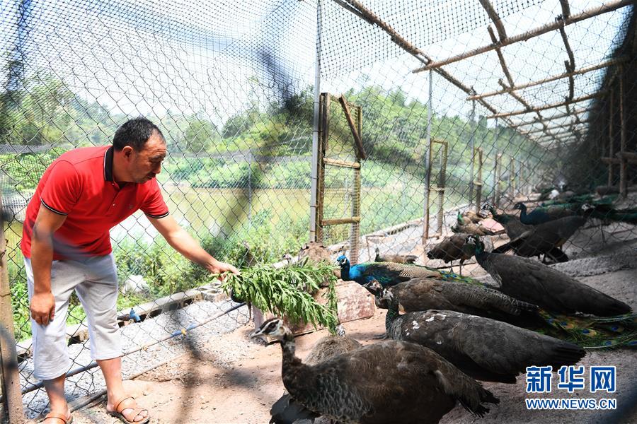 5月16日,在重慶市銅梁區(qū)永嘉鎮(zhèn)高龍村,閻仁兵在養(yǎng)殖場(chǎng)內(nèi)給藍(lán)孔雀喂食。 新華社記者 王全超 攝
