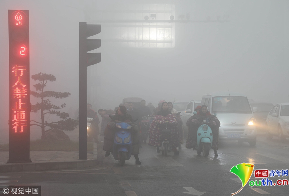 2018年11月12日,河南平頂山寶豐縣出現(xiàn)大霧, 街頭汽車打開(kāi)霧燈,行人小心行走。