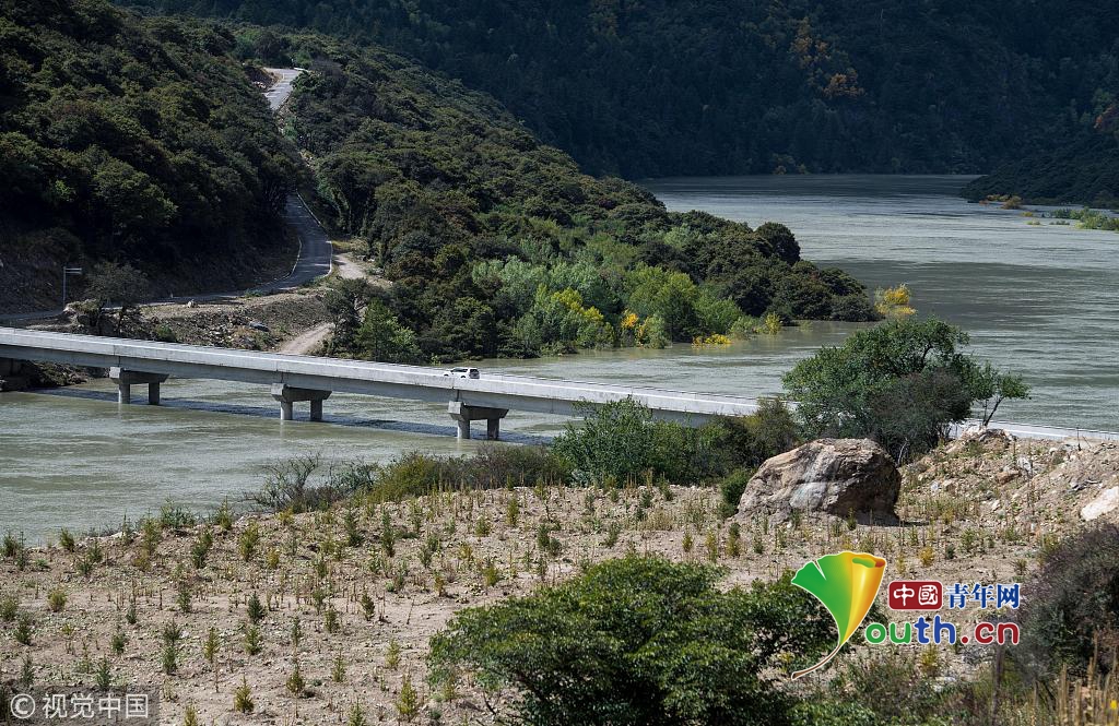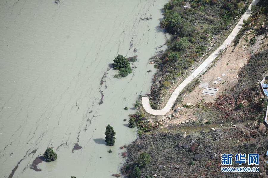 空中俯瞰通往加拉村已淹沒的公路(10月18日攝)。  新華社記者 普布扎西攝