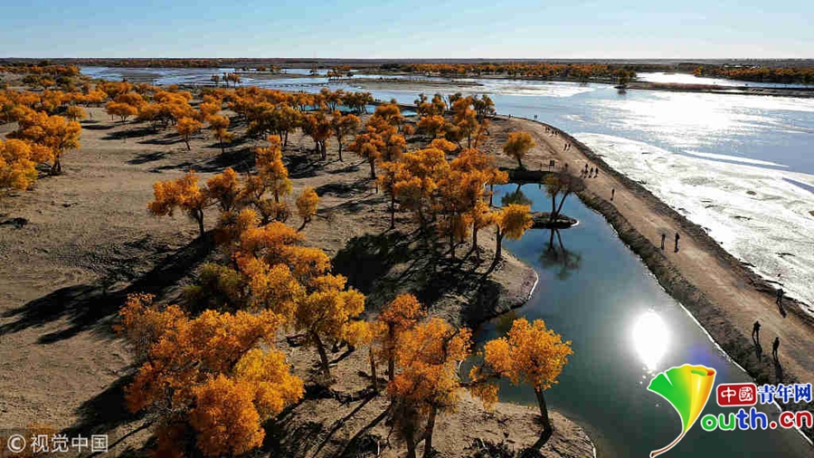 中國青年網北京10月9日電 2018年10月7日至8日,內蒙古自治區(qū)阿拉善盟額濟納旗,地處巴丹吉林沙漠。額濟納河兩岸壯觀的胡楊林堪稱大漠的一顆綠色明珠,每年深秋時節(jié)的第一場秋霜過后,大片的胡楊樹葉由綠變黃,一眼望去,陽光下金色的樹葉襯著湛藍的天空于風中婆娑起舞,鮮明的影調,亮麗的色彩,令人流連忘返。