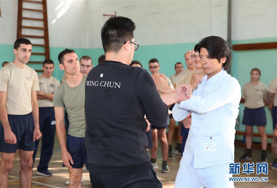 11月13日,在馬耳他首都瓦萊塔,鄭祖杰(前右)向馬耳他士兵展示詠春拳。 當(dāng)日,中國國家級(jí)非物質(zhì)文化遺產(chǎn)詠春拳代表性傳承人鄭祖杰走進(jìn)馬耳他武裝部隊(duì),向官兵展示詠春拳。這一活動(dòng)是馬耳他中國文化中心與馬耳他武術(shù)協(xié)會(huì)合辦的詠春拳系列展示活動(dòng)之一。 新華社記者 袁韻 攝