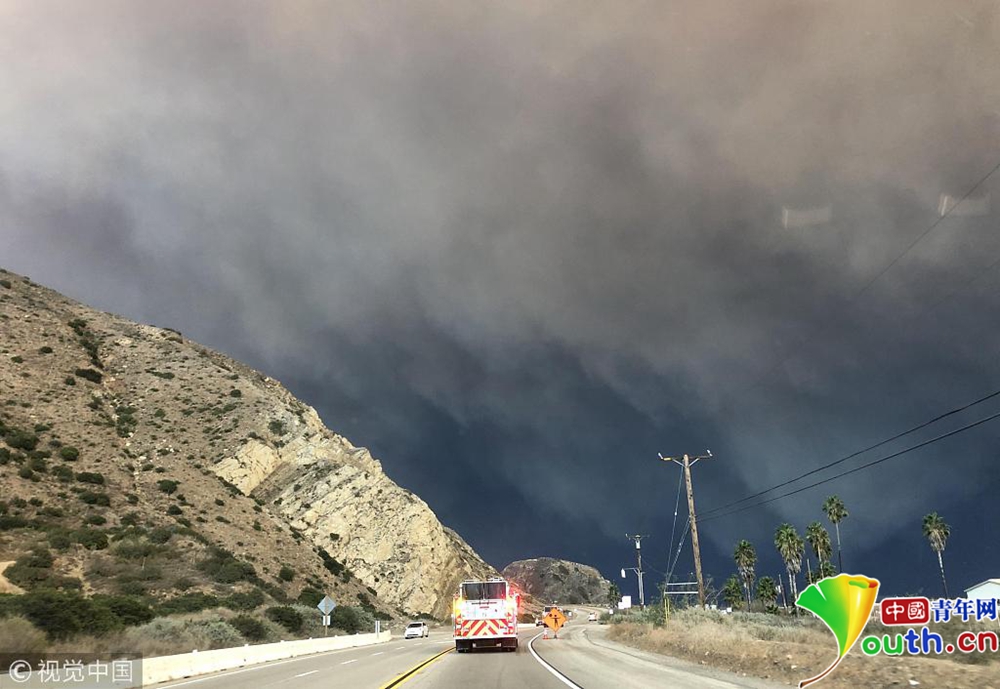 當(dāng)?shù)貢r(shí)間11月9日下午,美國加利福尼亞州南部文圖拉郡(Ventura County)等地熊熊山火已延燒逾萬英畝,濃煙遮天蔽日。