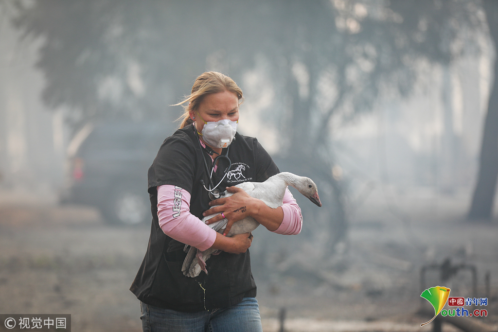當(dāng)?shù)貢r(shí)間2018年11月10日,美國加州Paradise,當(dāng)?shù)厣交鹚僚?,?zāi)區(qū)民眾紛紛帶領(lǐng)家畜進(jìn)行轉(zhuǎn)移。自本周三開始,加州多地發(fā)生山火,火勢(shì)蔓延迅猛,數(shù)萬人被迫撤離,數(shù)以萬計(jì)的房屋被燒毀。圖片作者:Jessica Christian