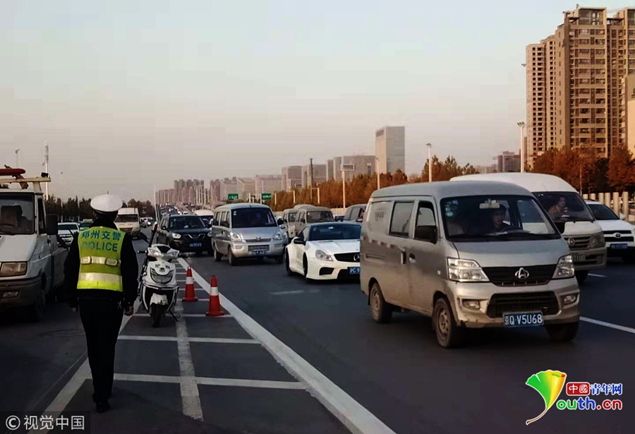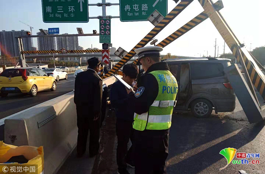 2018年11月19日下午,鄭州市西三環(huán)化工路立交橋,沿西三環(huán)由北向南方向上橋口處,一輛商務(wù)面包車失控撞塌了3米限高架,橋上交通瞬間中斷。 圖片來源:視覺中國