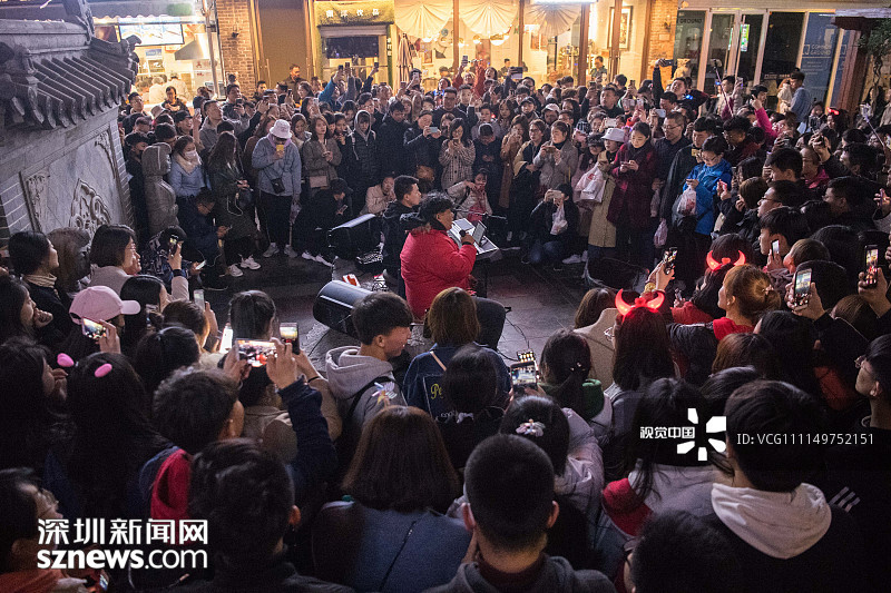 2018年4月6日晚,清明小長(zhǎng)假的第二天,在山東省濟(jì)南市復(fù)古老街區(qū)寬厚里,暫停演出有段時(shí)日的網(wǎng)紅歌唱組合“連音社”悄然復(fù)出,吸引了當(dāng)?shù)匾约皝?lái)自全國(guó)各地游客的圍觀。