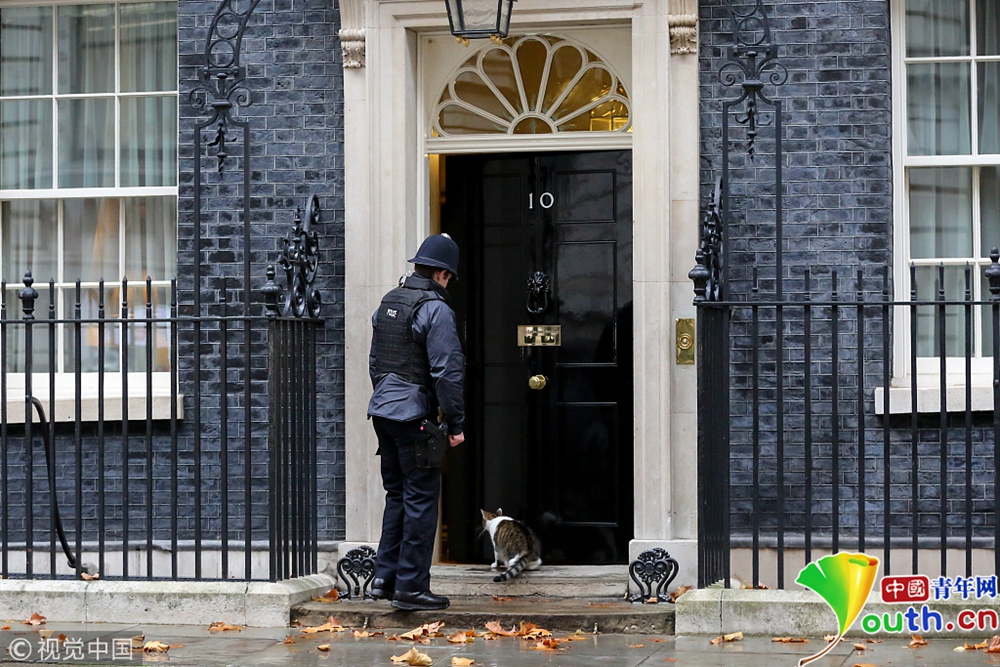 2018年11月22日訊,當(dāng)?shù)貢r(shí)間2018年11月20日,英國倫敦,在英國天空電視臺當(dāng)日就英“退歐”相關(guān)會議進(jìn)行直播報(bào)道時(shí),攝像機(jī)意外捕捉到了一副畫面:被關(guān)在門外的拉里起先“安靜且耐心地”蹲坐在唐寧街10號的黑色大門前,過了一會兒它淡淡地撇了一眼正在不遠(yuǎn)處執(zhí)勤的警察。后者顯然立馬接收到了“首席貓”的眼神示意,他快速走上前來,替拉里敲開門,助它重返溫暖的室內(nèi)。據(jù)悉,唐寧街10號那扇赫赫有名的黑色大門只能由內(nèi)部打開。