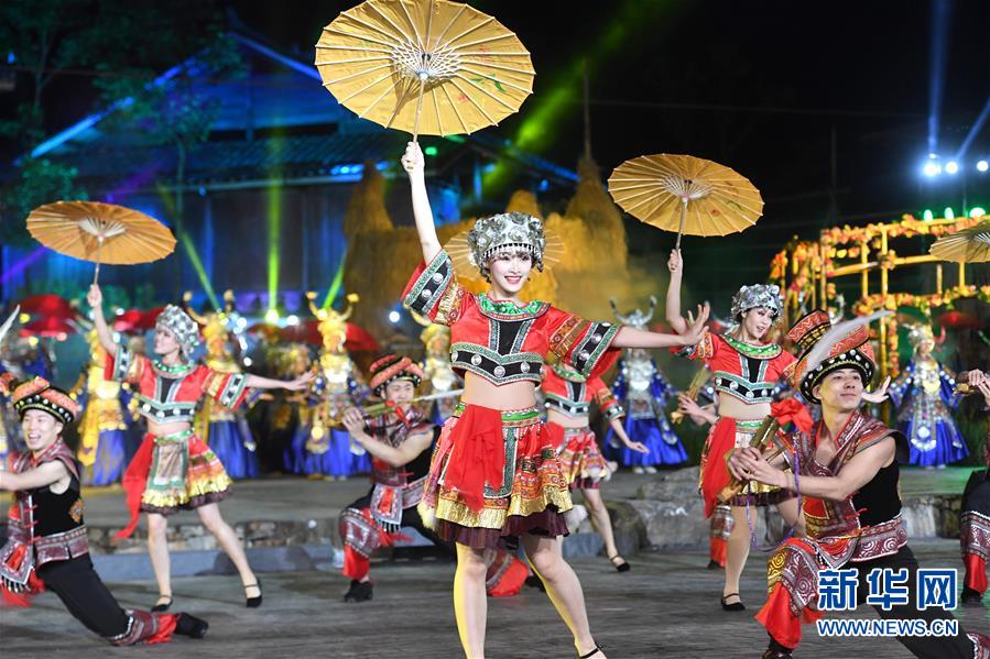 11月21日,演員表演歌舞《風(fēng)從苗山來》。 當(dāng)日,廣西柳州市第一屆旅游產(chǎn)業(yè)發(fā)展大會(huì)暨2018第十八屆中國·融水苗族蘆笙斗馬節(jié)開幕式晚會(huì)在融水苗族自治縣舉行。 新華社記者 周華 攝