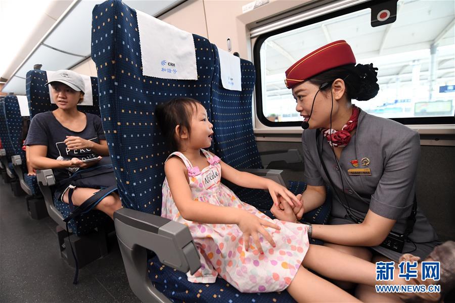 在南寧東站,一名列車(chē)工作人員在和一名小朋友交流(2017年8月5日攝)。 廣西壯族自治區(qū)成立60年來(lái),鐵路建設(shè)發(fā)生翻天覆地的變化。來(lái)自中國(guó)鐵路南寧局集團(tuán)有限公司的數(shù)據(jù)顯示,1958年廣西鐵路總里程為1346.3公里,如今廣西鐵路總里程達(dá)5191公里。廣西與周邊相鄰省份間實(shí)現(xiàn)動(dòng)車(chē)“公交化”開(kāi)行。此外,北部灣港—重慶班列、東盟海產(chǎn)品冷鏈班列、“百色一號(hào)”果蔬專(zhuān)列等的開(kāi)通和運(yùn)營(yíng),強(qiáng)化了鐵路供給的針對(duì)性和有效性。鐵路成為助推廣西經(jīng)濟(jì)社會(huì)快速發(fā)展的“大動(dòng)脈”。 新華社記者陸波岸攝