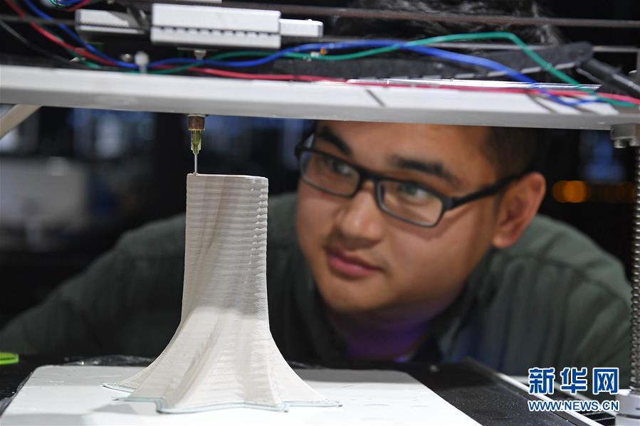 在江西景德鎮(zhèn)陶溪川文創(chuàng)街區(qū),一位工作人員正在用3D打印技術制作陶瓷花瓶(2017年4月8日攝)。 新華社記者 萬象 攝