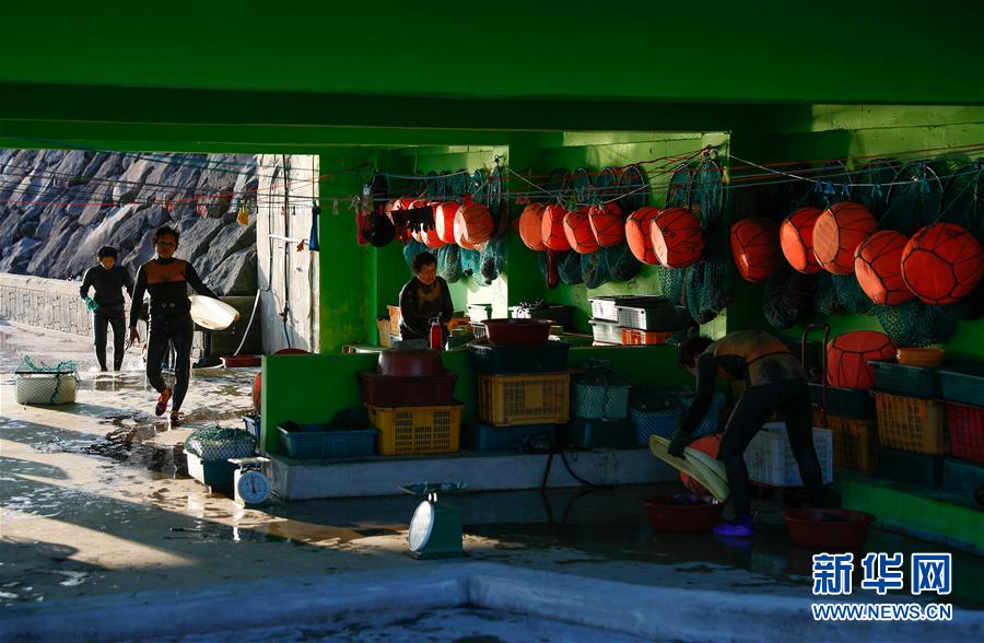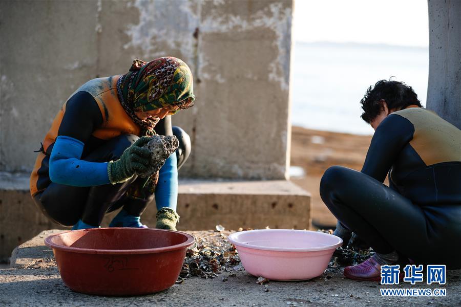 11月23日,海女們在韓國濟(jì)州島的一處海岸附近處理打撈出的海產(chǎn)品。新華社記者王婧嬙攝