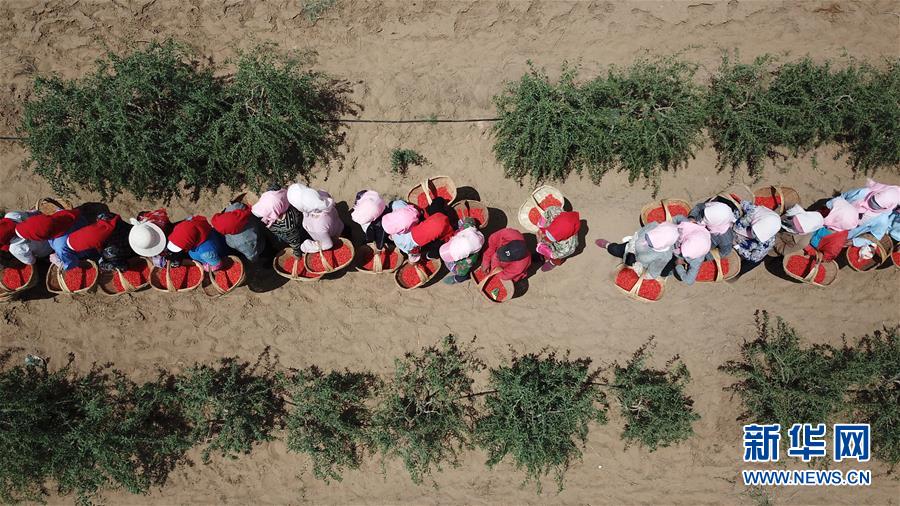 紅寺堡生態(tài)移民區(qū)的移民在百瑞源枸杞種植基地采摘頭茬枸杞(5月30日無人機(jī)拍攝)。近日,在寧夏吳忠市紅寺堡區(qū)百瑞源枸杞種植基地,頭茬枸杞迎來采摘收獲季。今年頭茬枸杞采摘期比往年提前20天左右。據(jù)了解,該基地地處紅寺堡生態(tài)移民區(qū),占地3000畝,采摘季節(jié)每天有數(shù)百名當(dāng)?shù)匾泼裨谔镩g采摘?jiǎng)谧?。新華社記者王鵬 攝