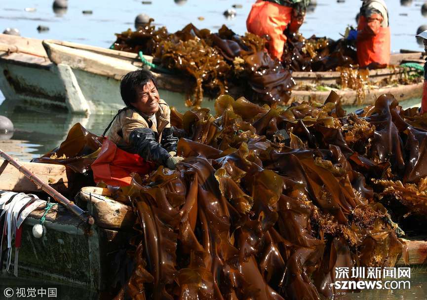 深圳新聞網(wǎng)訊 2018年5月26日,在山東省榮成市一海上養(yǎng)殖區(qū),工人們正在收割海帶。