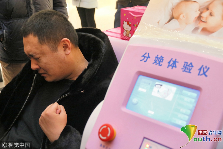 2018年3月8日,一名男士在山東煙臺(tái)大悅城通過(guò)“分娩體驗(yàn)儀”感受“分娩”時(shí)的陣痛。