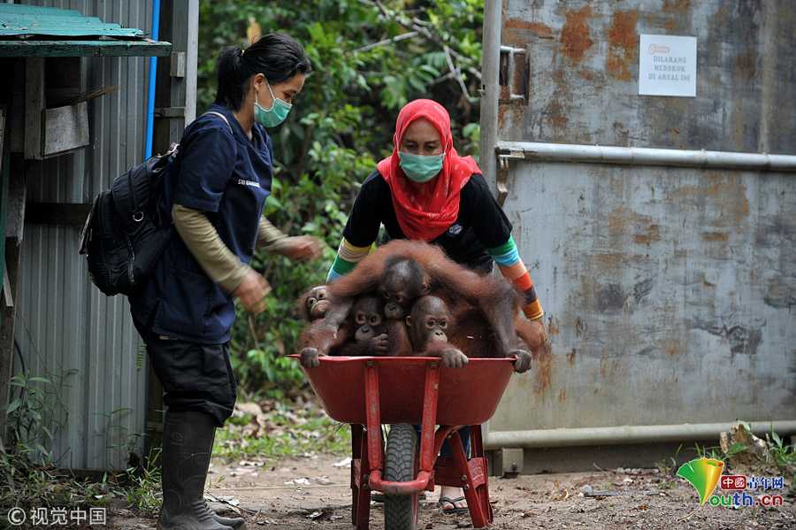 當?shù)貢r間2018年9月18日,印尼加里曼丹克塔邦,國際動物救援(IAR)猩猩安全與保護中心里,飼養(yǎng)員用獨輪車把猩猩寶寶送到森林學校。圖片作者:Newscom