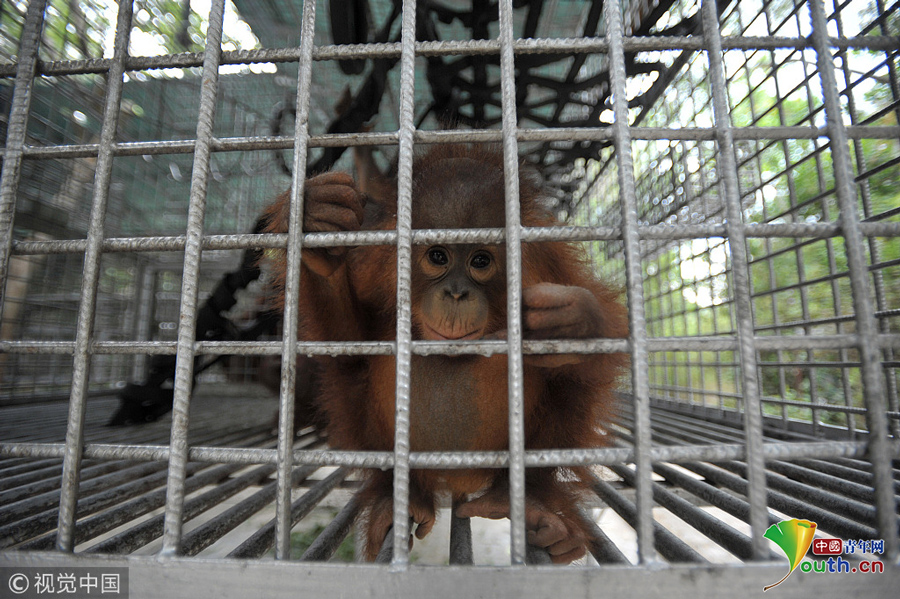 當(dāng)?shù)貢r間2018年9月18日,印尼加里曼丹克塔邦,國際動物救援(IAR)猩猩安全與保護(hù)中心里,飼養(yǎng)員用獨(dú)輪車把猩猩寶寶送到森林學(xué)校。圖片作者:Newscom