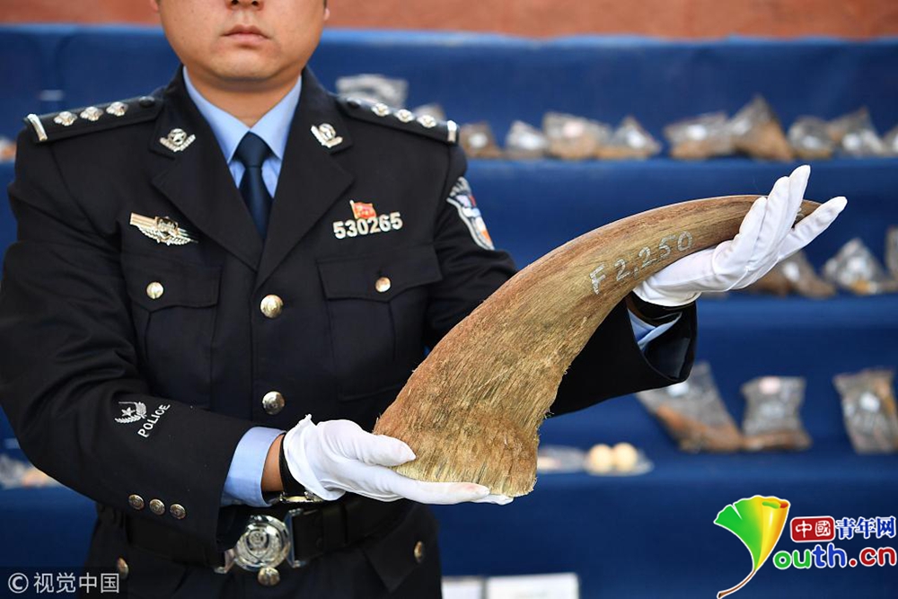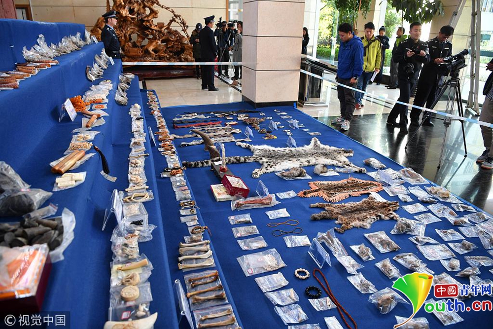 11月23日,現(xiàn)場(chǎng)展示警方查獲的野生動(dòng)物制品。當(dāng)日,昆明市森林公安局向媒體通報(bào),破獲一系列特大非法收購(gòu)出售珍貴瀕危野生動(dòng)物及其制品案件。
