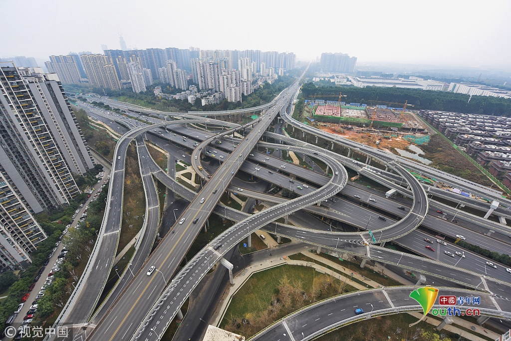 2018年11月23日,成都,俯瞰整個(gè)嬌子立交的全貌:12條匝道已經(jīng)完工,道路標(biāo)線、路面路況、指示牌都是全新的,不時(shí)有車輛在三環(huán)路和成龍路之間轉(zhuǎn)換。