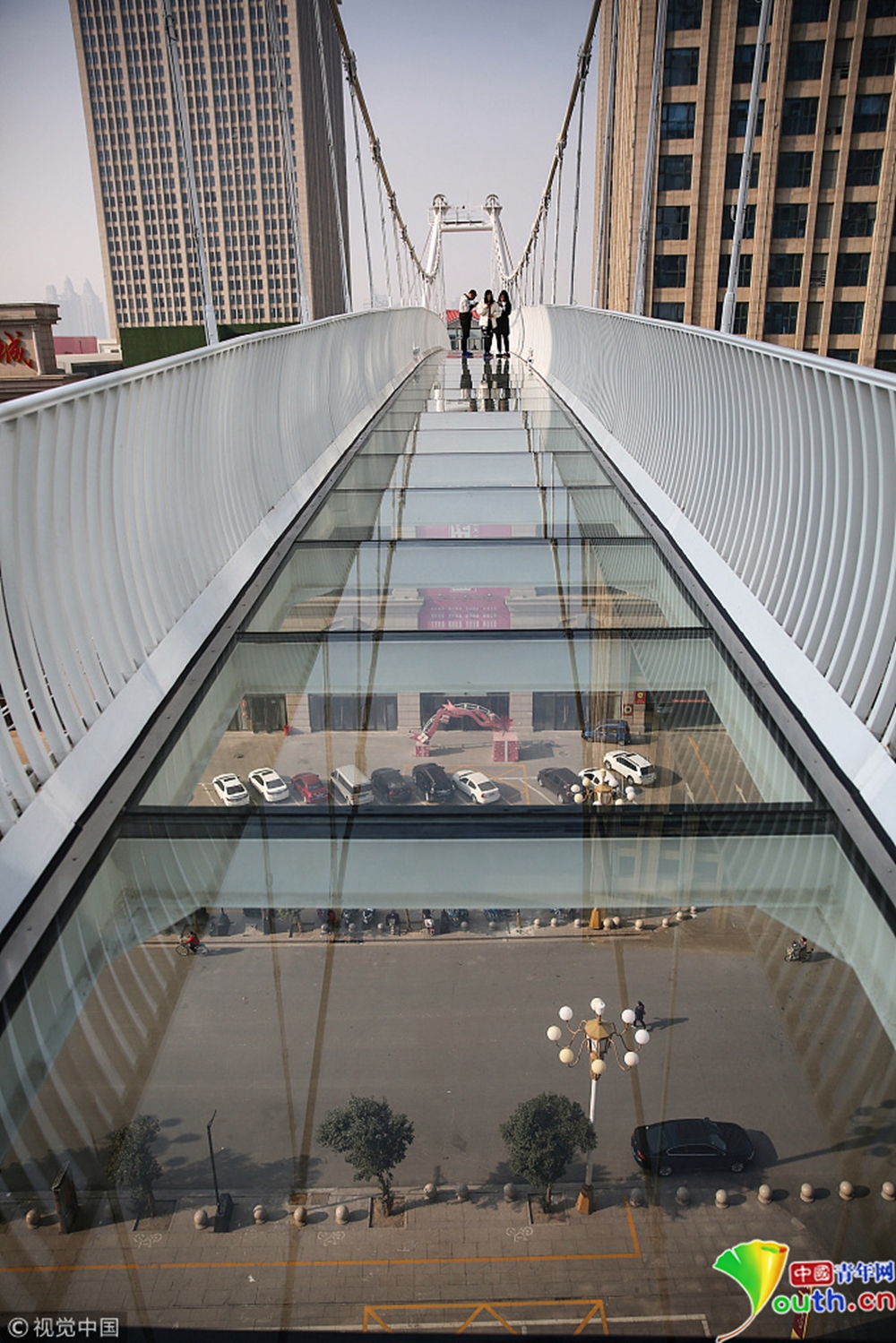 這座玻璃吊橋位于石家莊南二環(huán)附近,橋體橫跨塔通大街,長(zhǎng)100米,高30米,。橋面由52塊特質(zhì)玻璃構(gòu)成,其中4塊為特效玻璃,游客腳踩上去就會(huì)發(fā)出玻璃破裂的聲音。