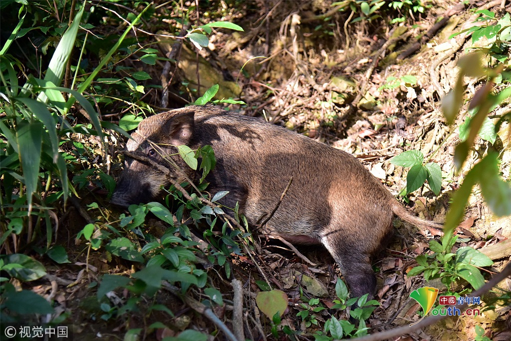 山豬個(gè)頭不大,身長1米左右,毛色呈深褐色。從體型判斷,這只山豬應(yīng)該體重在35公斤左右,估計(jì)年齡只有1歲。
