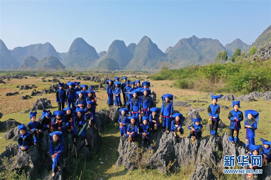 廣西百色靖西市安德鎮(zhèn)中心小學(xué)的孩子們在排練山歌(11月28日無人機拍攝)。 新華社記者 周華攝