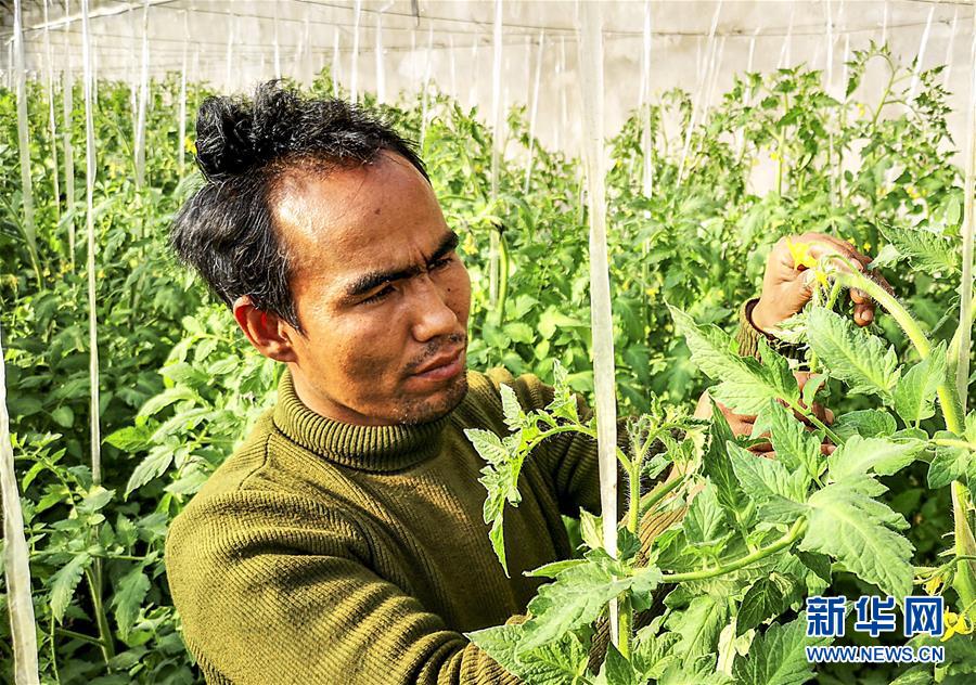 拜什托格拉克鄉(xiāng)和融新村村民艾力·吾吉艾合麥提在大棚里查看番茄的生長情況(11月29日攝)。 新華社記者 白志強 攝