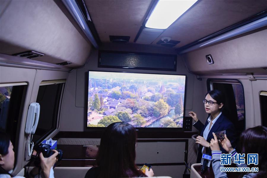 在浙江移動烏鎮(zhèn)分水墩營業(yè)廳外,工作人員在一輛體驗(yàn)巴士內(nèi)介紹通過5G移動傳輸技術(shù)實(shí)現(xiàn)的8K高清的視頻畫面實(shí)時展示(10月30日攝)。 新華社記者黃宗治攝