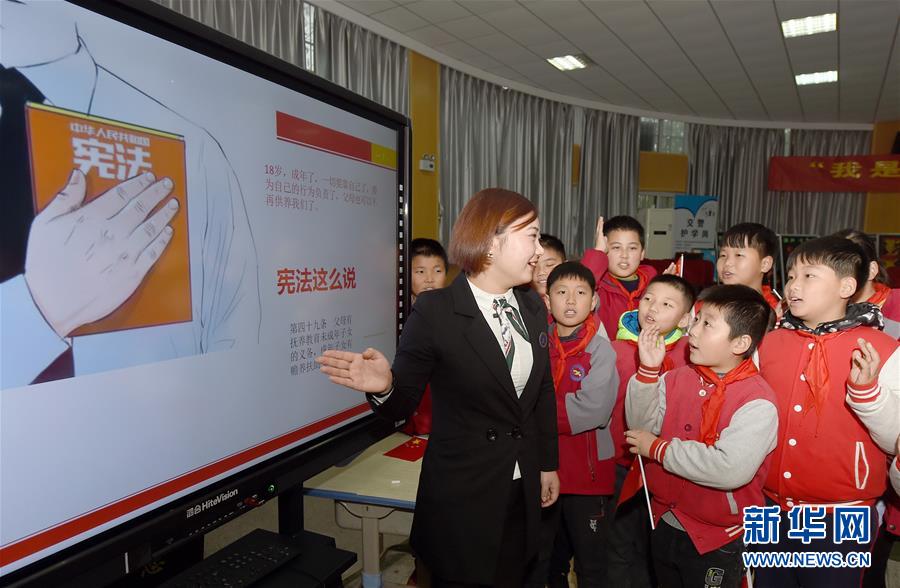 12月3日,合肥市經(jīng)開區(qū)明珠居委會法律援助律師在給明珠小學(xué)的學(xué)生們講解憲法知識。國家憲法日到來之際,各地學(xué)校紛紛舉辦主題宣講活動,對學(xué)生開展法治教育,幫助孩子們了解憲法知識。新華社記者 郭晨 攝