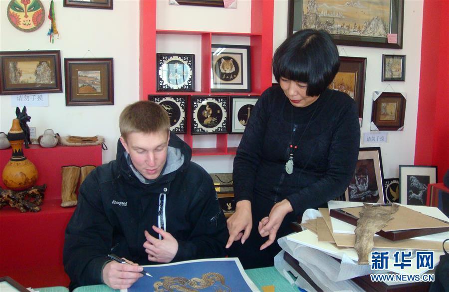 張琳在位于哈爾濱的工作室指導(dǎo)前來參觀學(xué)習(xí)的外國學(xué)生制作魚皮畫(2011年3月20日攝)。國家級非物質(zhì)文化遺產(chǎn)赫哲族魚皮制作技藝是我國赫哲族傳統(tǒng)手工藝術(shù)。作為這項技藝的黑龍江省級傳承人,十余年來,張琳一直從事魚皮畫的研究和創(chuàng)作,并通過做推廣、開講座、辦活動,讓更多年輕人了解并喜歡上這一傳統(tǒng)手工藝,將這項瀕臨失傳的藝術(shù)更好地傳承下去。新華社發(fā)