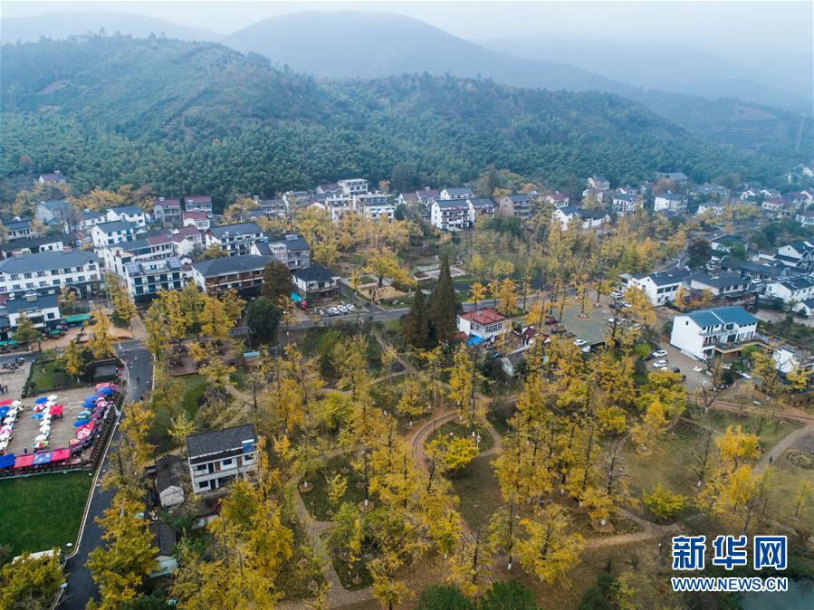 空中俯瞰十里銀杏林長廊(11月16日無人機拍攝)。近日,在浙江省長興縣小浦鎮(zhèn),“十里銀杏長廊”和近千畝花海經(jīng)過近一年的升級改造后,以嶄新的面貌與游客見面?;ê!⒂^光小火車、古村民宿、銀杏長廊等旅游項目全面提升了小浦鎮(zhèn)鄉(xiāng)村旅游的品質。新華社記者 徐昱 攝