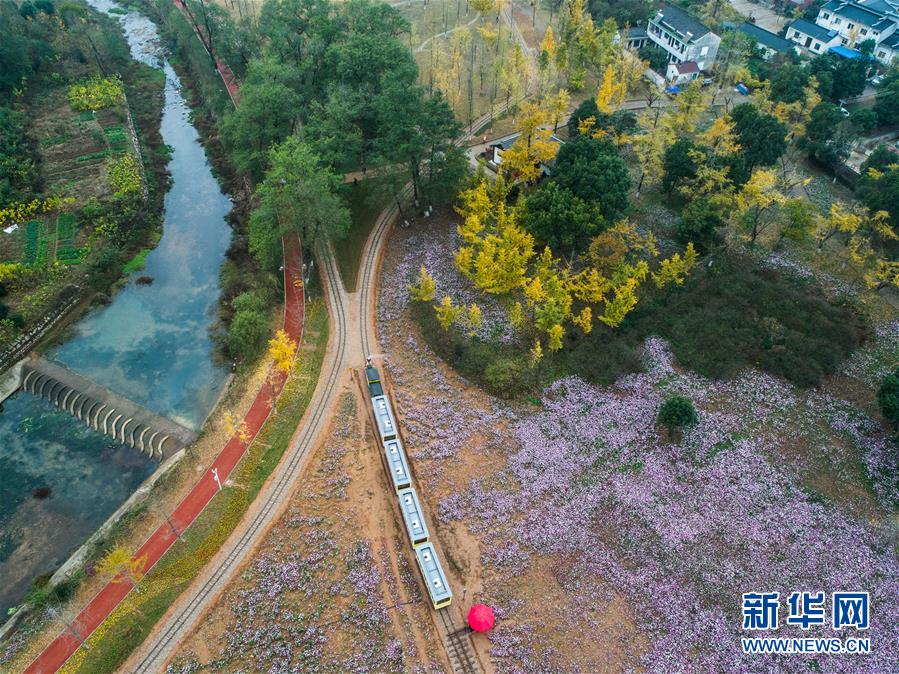 一列觀光小火車帶著游客穿行在銀杏林和花海之間(11月16日無人機(jī)拍攝)。近日,在浙江省長興縣小浦鎮(zhèn),“十里銀杏長廊”和近千畝花海經(jīng)過近一年的升級改造后,以嶄新的面貌與游客見面?;ê?、觀光小火車、古村民宿、銀杏長廊等旅游項目全面提升了小浦鎮(zhèn)鄉(xiāng)村旅游的品質(zhì)。新華社記者 徐昱 攝