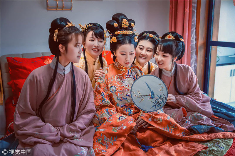 婚禮現(xiàn)場(chǎng)布置小橋流水,擺滿桃花樹,樹上桃花朵朵,競(jìng)相開放。女孩非常追求婚禮的隆重氣氛,專門搭建了一座矮橋,飄落的花瓣靜躺水面,充滿詩(shī)情畫意。圖為婚禮現(xiàn)場(chǎng),新娘和伴娘。