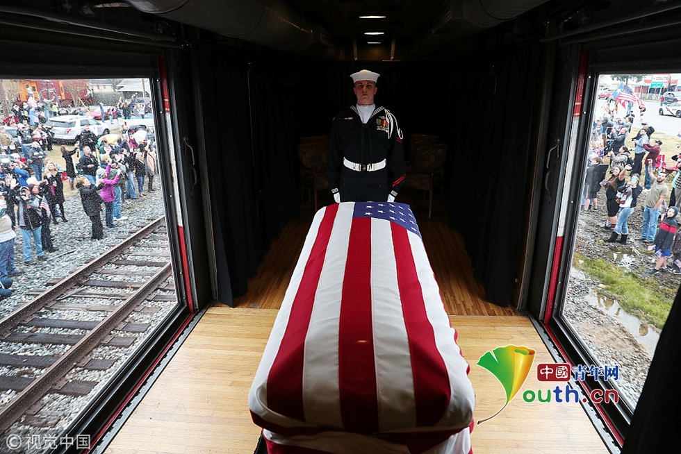 當地時間2018年12月6日,美國德州,美國前總統老布什將落葬德州農機大學布什總統圖書館和博物館后面的布什家族墓地,與他半年前去世的妻子芭芭拉以及早夭的女兒蘿賓葬在一起。當天,一輛葬禮專列將載著老布什的棺槨及其親朋,從休斯敦郊區(qū)開往老布什的最后安葬之地、德州農機大學。這列火車的第六節(jié)車廂側面是透明的,人們可以在鐵軌旁看到老布什蓋著國旗的靈樞。圖片作者:Joe Raedle/視覺中國