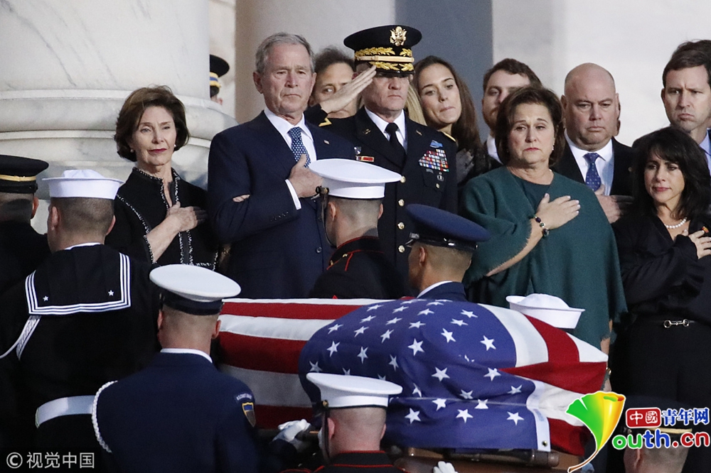 老布什靈柩安放在國(guó)會(huì)圓形大廳 小布什出席儀式