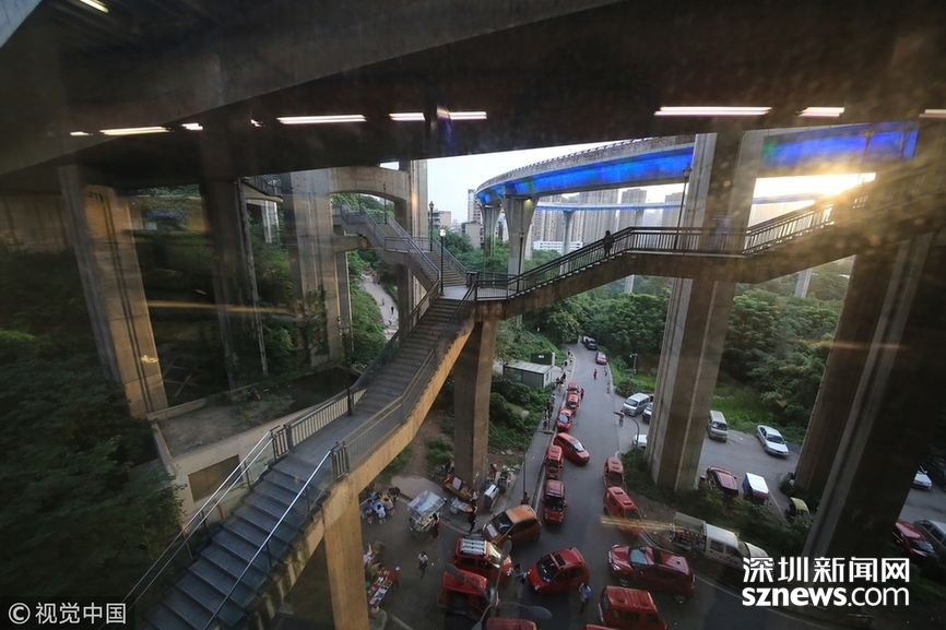 2018年5月29日,重慶,魔幻重慶又雙叒叕放大招!還有一個獨特的亮點,重慶軌道交通3號線銅元局站,出口由一段長梯銜接上方立交橋和下方的路面,與全國最高城市立交橋蘇家壩立交組成了獨特風(fēng)景,許多游客專門趕來拍照。