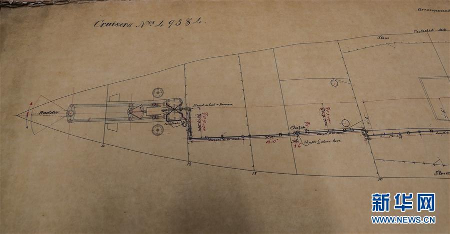 這是11月2日在英國紐卡斯?fàn)柕奶┒鳌枡n案館拍攝的致遠(yuǎn)艦設(shè)計圖紙。 新華社記者日前在紐卡斯?fàn)柼┒鳌枡n案館查找北洋海軍史料時發(fā)現(xiàn)一套七張、檔案名為“中國巡洋艦舵機(jī)設(shè)計圖”的原始圖紙。塵封百年,甲午海戰(zhàn)中抗擊日艦后沉沒的清北洋海軍致遠(yuǎn)艦部分原廠設(shè)計圖紙在其建造地——英國紐卡斯?fàn)柺械囊患覚n案館首次被發(fā)現(xiàn),為打撈那段悲壯的歷史提供了重要參考。 新華社記者 韓巖 攝