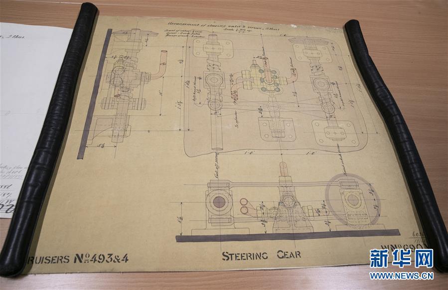 這是11月2日在英國(guó)紐卡斯?fàn)柕奶┒鳌枡n案館拍攝的致遠(yuǎn)艦設(shè)計(jì)圖紙。 新華社記者日前在紐卡斯?fàn)柼┒鳌枡n案館查找北洋海軍史料時(shí)發(fā)現(xiàn)一套七張、檔案名為“中國(guó)巡洋艦舵機(jī)設(shè)計(jì)圖”的原始圖紙。塵封百年,甲午海戰(zhàn)中抗擊日艦后沉沒(méi)的清北洋海軍致遠(yuǎn)艦部分原廠設(shè)計(jì)圖紙?jiān)谄浣ㄔ斓亍?guó)紐卡斯?fàn)柺械囊患覚n案館首次被發(fā)現(xiàn),為打撈那段悲壯的歷史提供了重要參考。 新華社記者 韓巖 攝