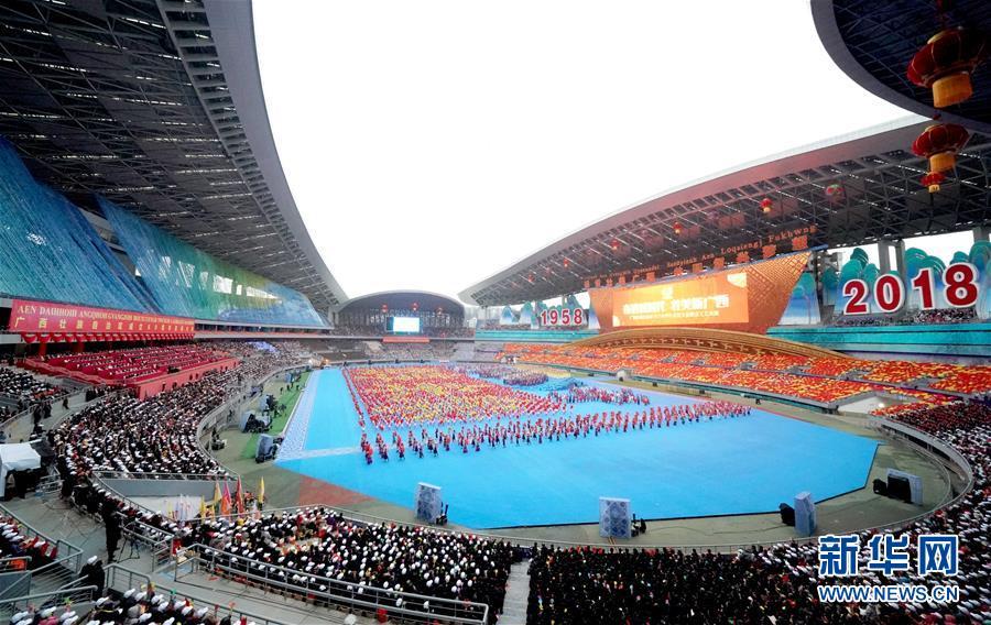 12月10日,廣西壯族自治區(qū)成立60周年慶祝大會在廣西體育中心隆重舉行。這是慶祝大會上的群眾文藝表演。 新華社記者 申宏 攝