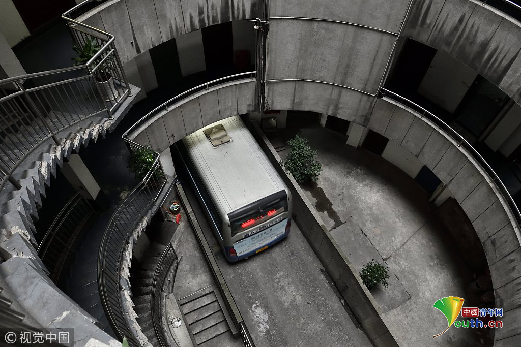 2018年12月6日,重慶江北紅旗河溝汽車站內,有一棟獨特的八層圓環(huán)狀建筑,底層每天有不少進出站的客車通行。據(jù)悉,這棟樓建于1990年,曾經(jīng)是車站旅館,如今一、二兩層用于車站辦公,其余樓層已廢棄。為確保安全,三層以上已經(jīng)被封鎖。圖為公交車穿過8層空心圓筒樓。徐勇/視覺中國