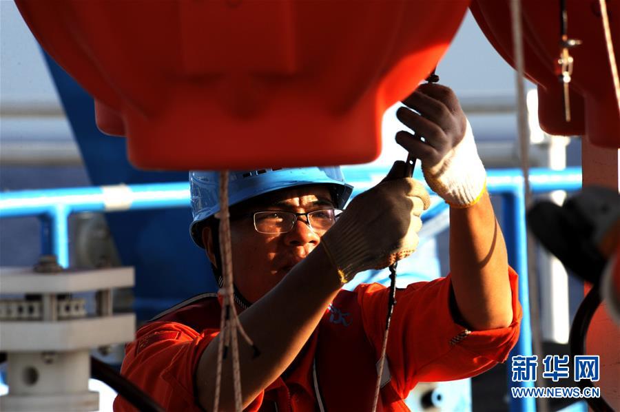 考察隊員在布放“彩虹魚”著陸器前進行檢查工作(12月10日攝)。 由上海海洋大學和西湖大學聯合組成的“彩虹魚”科考團隊,12月11日在全球最深的海溝——馬里亞納海溝成功完成兩臺“彩虹魚”第二代著陸器的萬米級海試,深度分別為10918米和10899米。 新華社記者 張建松 攝