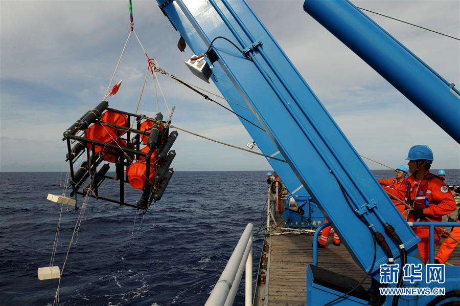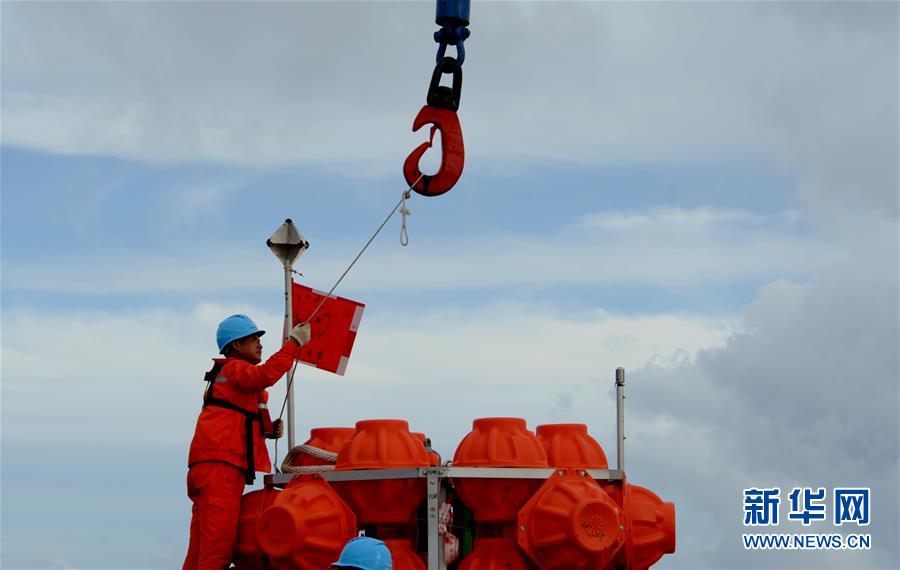 考察隊員將負責拍攝和誘捕生物的“彩虹魚”第二代著陸器布放到海里(12月10日攝)。 由上海海洋大學和西湖大學聯合組成的“彩虹魚”科考團隊,12月11日在全球最深的海溝——馬里亞納海溝成功完成兩臺“彩虹魚”第二代著陸器的萬米級海試,深度分別為10918米和10899米。 新華社記者 張建松 攝