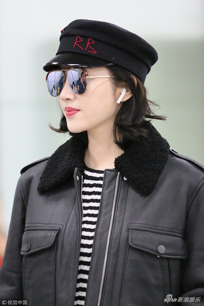 日前,景甜現身機場,身穿黑色皮夾克超有范兒,戴小帽酷似甜美女軍官。視覺中國/圖