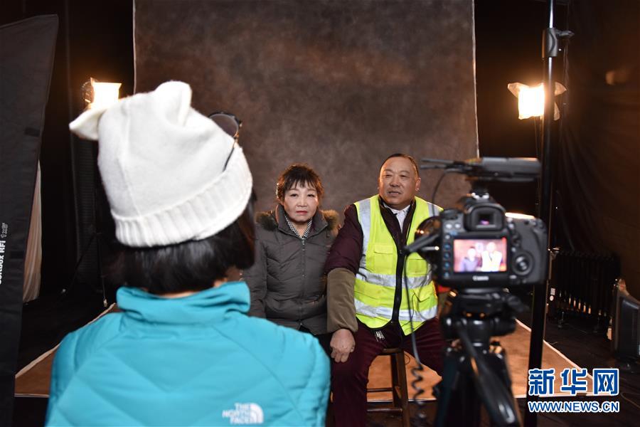 攝影師羅嫻在工地上搭建的臨時攝影棚內(nèi)指導(dǎo)農(nóng)民工夫妻擺姿勢(12月10日攝)。 新華社記者 白田田 攝