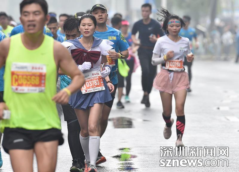2018年12月16日,深圳國際馬拉松位于后海的折返點,一名身著女仆裝的選手正在向終點沖刺。
