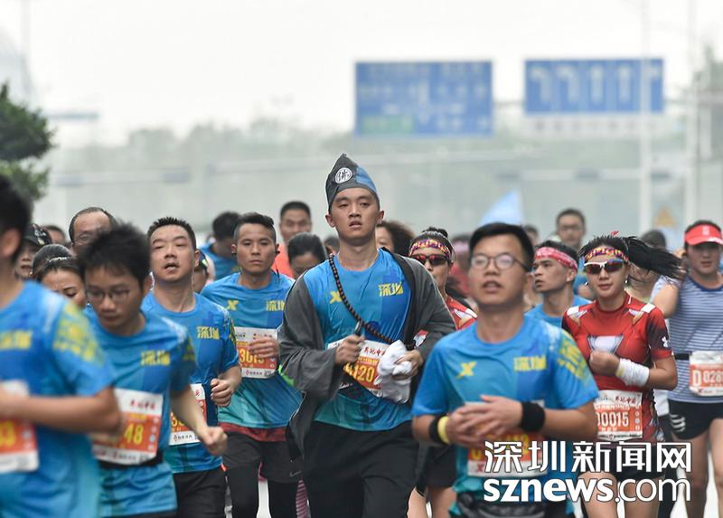 2018年12月16日,深圳國際馬拉松位于后海的折返點(diǎn),一名穿著濟(jì)公服裝的選手正在向終點(diǎn)沖刺。