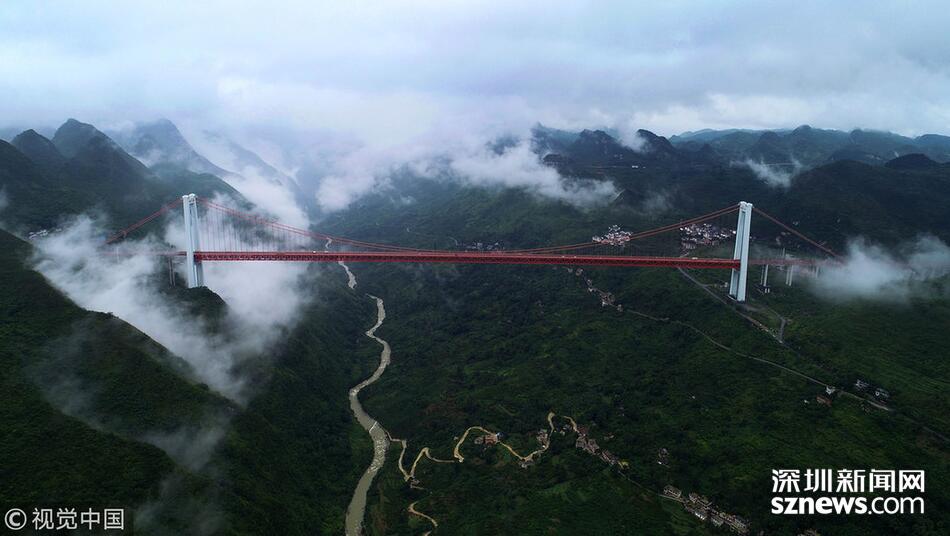 2018年6月26日,一場大雨后貴州省安順市關嶺縣壩陵河大峽谷云霧繚繞,橫跨兩岸的壩陵河大橋在云霧中時隱時現(xiàn),更顯雄偉壯觀。