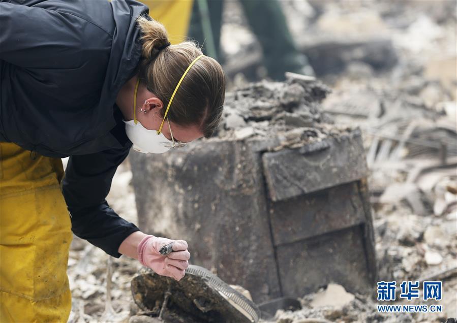 11月13日,在美國(guó)加利福尼亞州天堂鎮(zhèn),搜救人員在山火過(guò)后的廢墟工作。