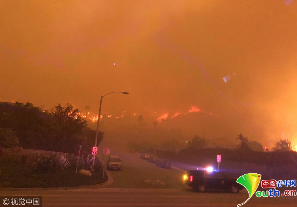 山火迅速蔓延至剛剛發(fā)生槍擊案的千橡樹(shù)市,并在9日翻過(guò)圣莫妮卡山,在強(qiáng)風(fēng)的助力下向海邊蔓延。