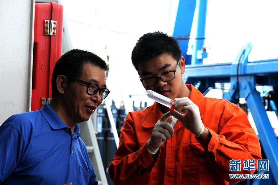 “彩虹魚”科考團(tuán)隊海上總指揮崔維成(左)和考察隊員耿道(右)在觀察捕獲的深淵生物(12月12日攝)。