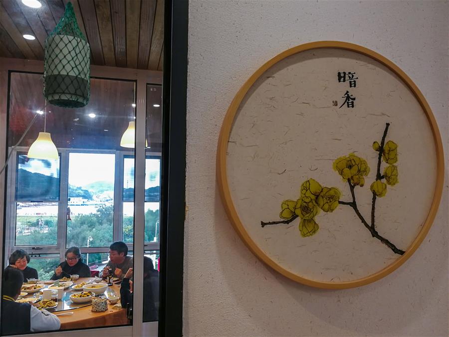 12月15日,客人在朱家尖烏石塘“漁夫客?!泵袼薨鼛麅?nèi)用餐,該民宿有海景房7間,餐飲包廂8個(gè)。 新華社記者 徐昱 攝