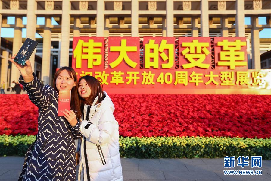 12月18日,參觀者在“偉大的變革——慶祝改革開放40周年大型展覽”外自拍留影。 截至當(dāng)日,在中國(guó)國(guó)家博物館舉行的“偉大的變革——慶祝改革開放40周年大型展覽”累計(jì)參觀人數(shù)突破160萬人次。 新華社記者 張玉薇 攝